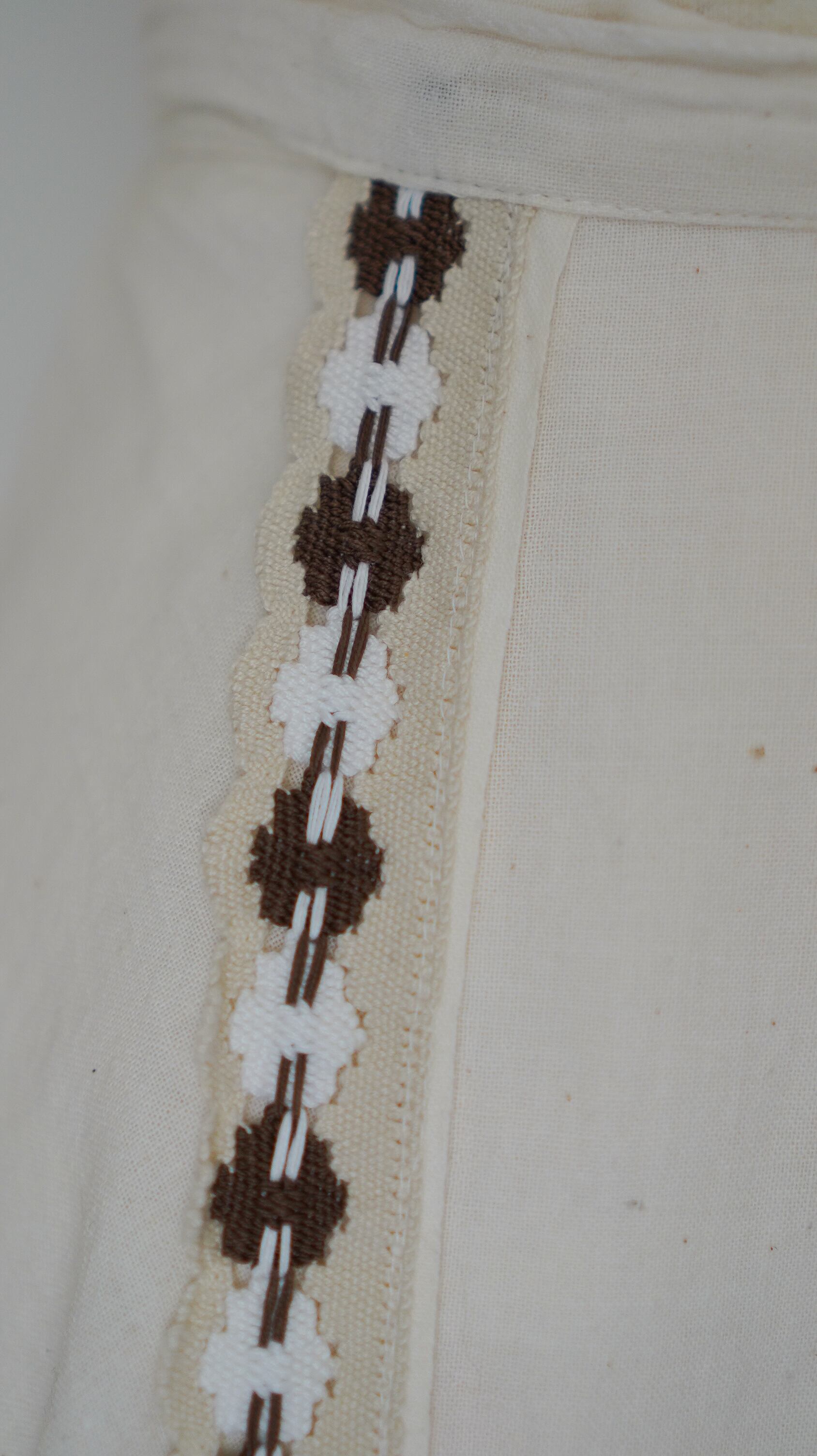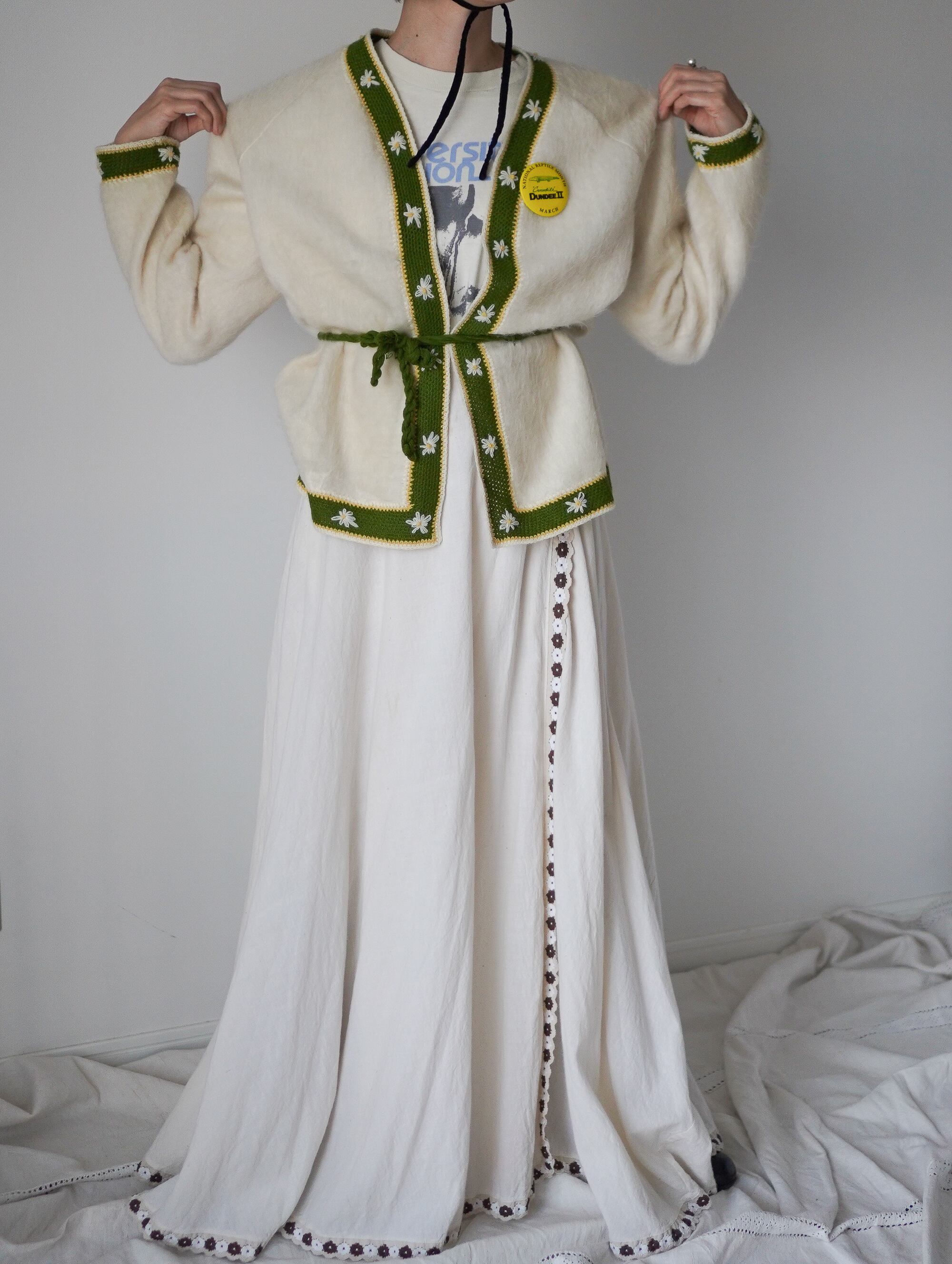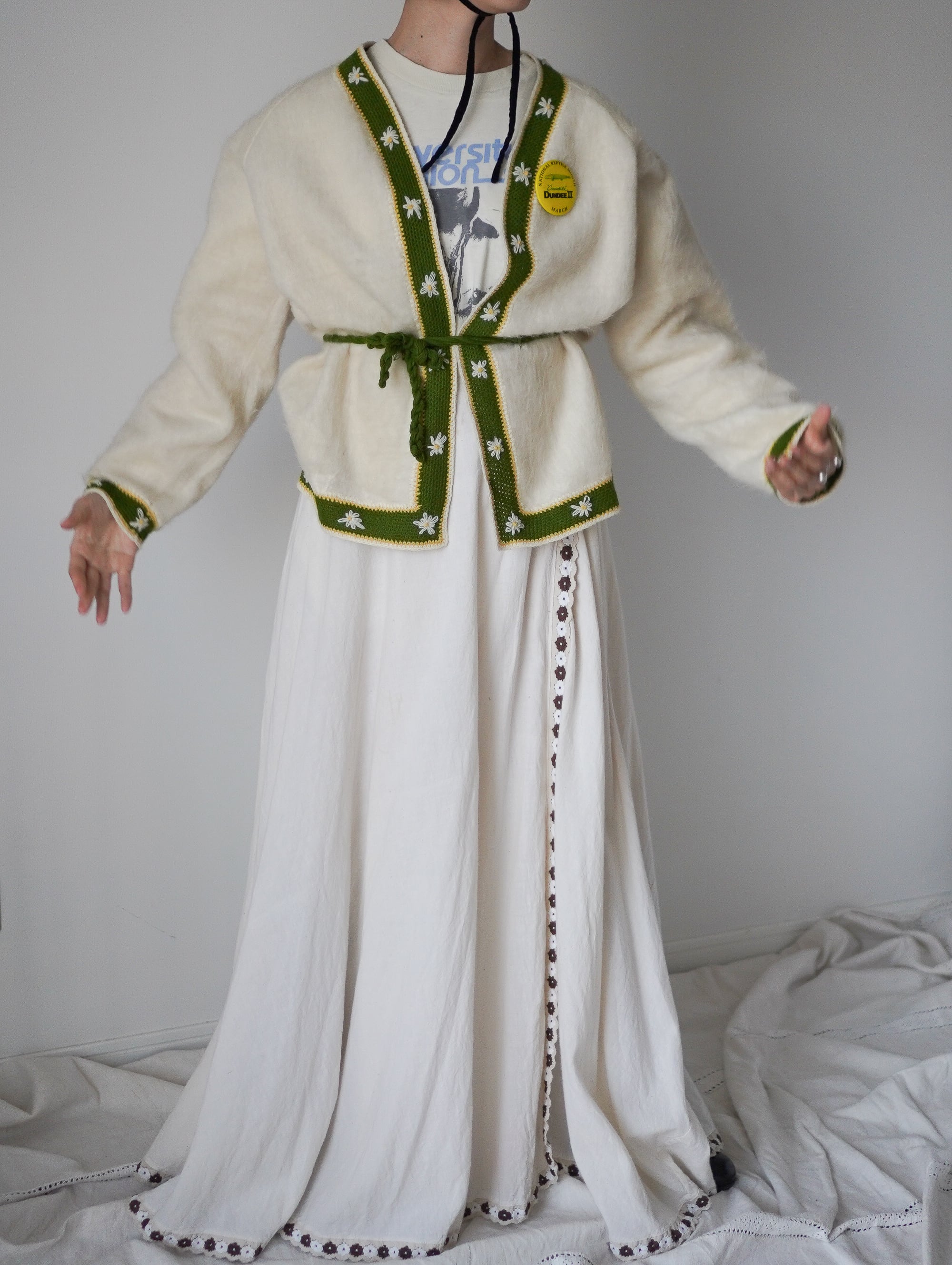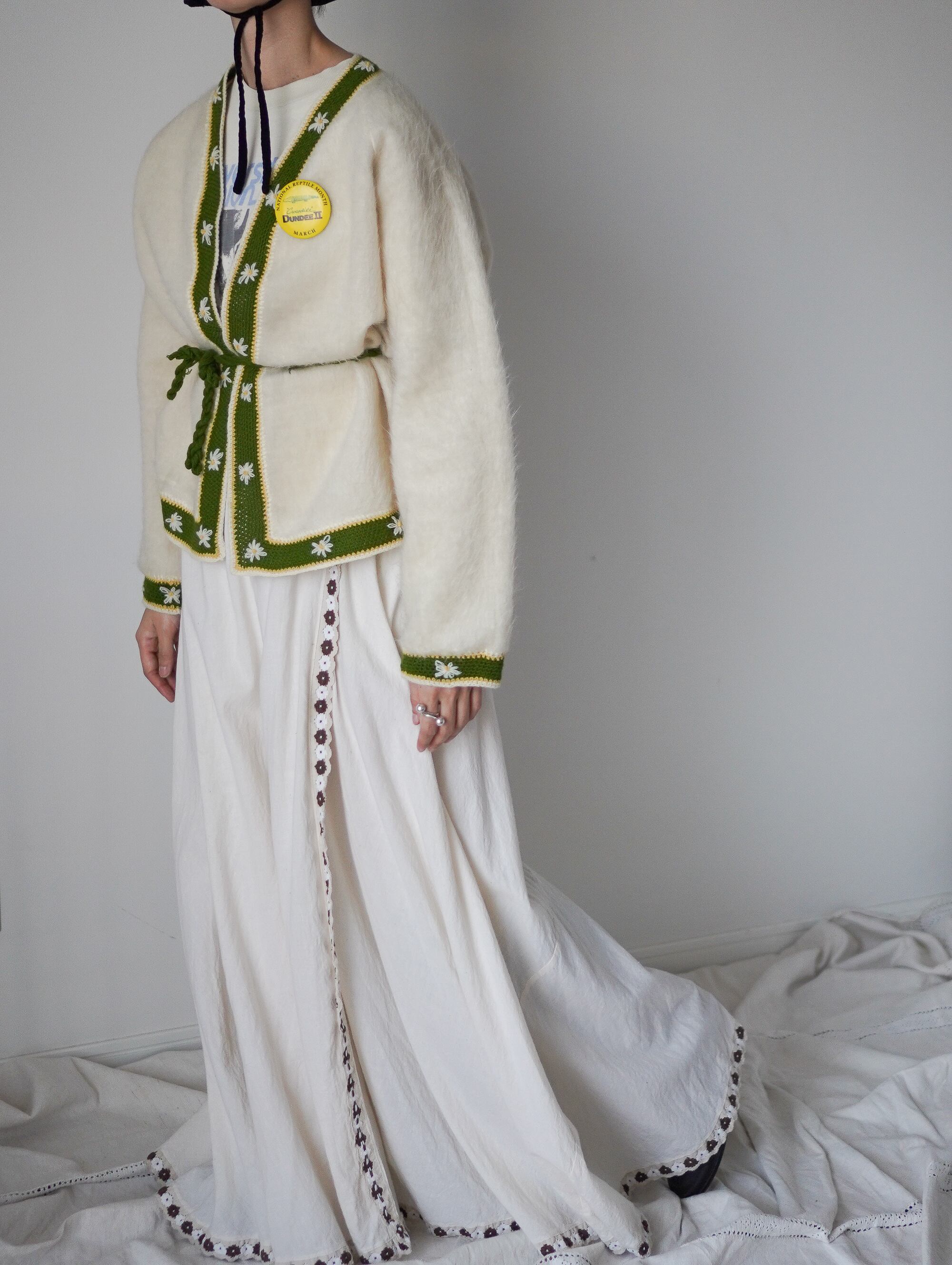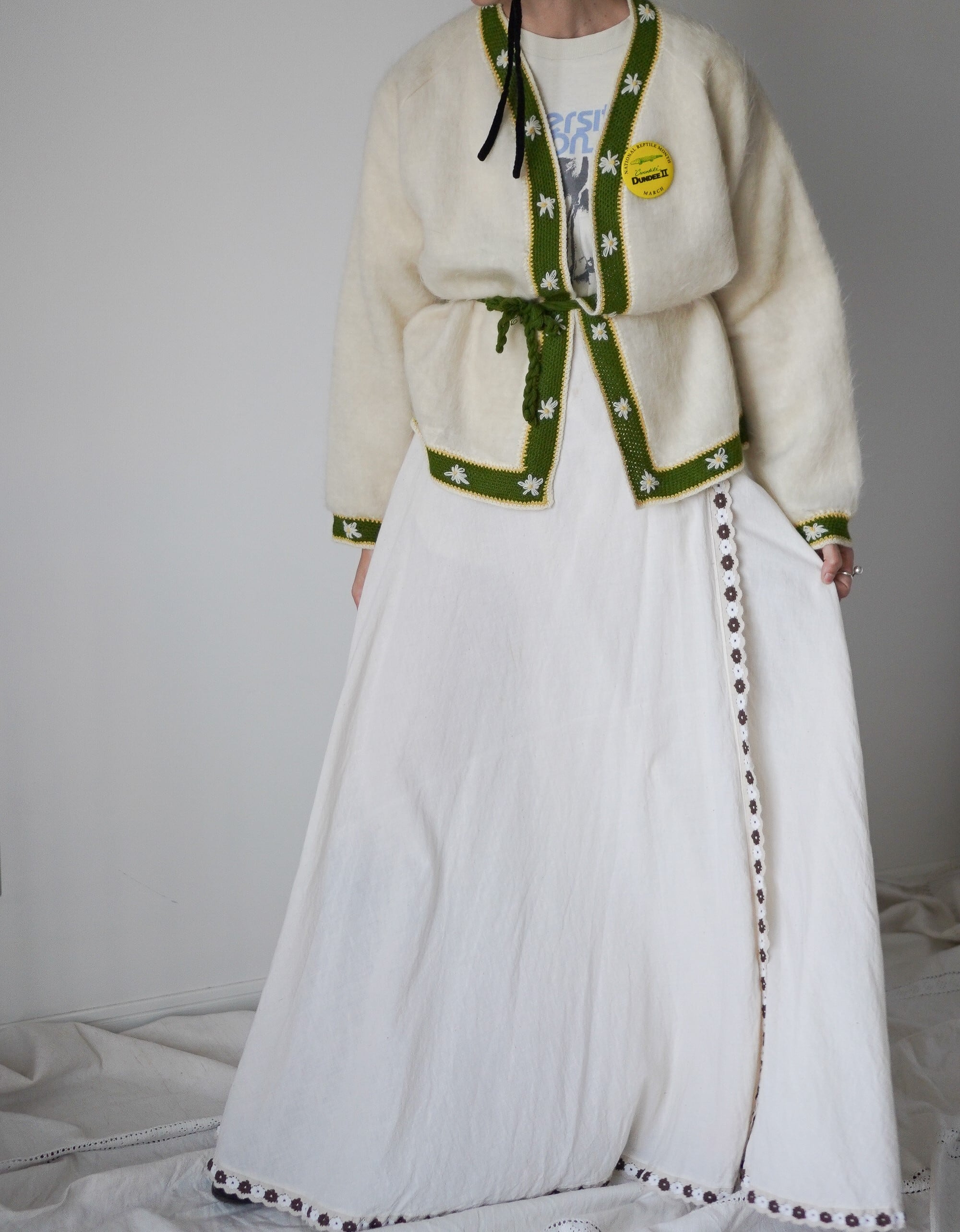 1970年代頃にハンドメイドでつくられた、生地量たっぷりのラップスカート。生地の端に施されているブラウンとホワイトのお花の刺繍入りリボンがチャームポイント。ハンドメイドです。ところどころ色移りのようなものがございますが、状態は良好です。動くとよりシルエットの美しさを感じます。
