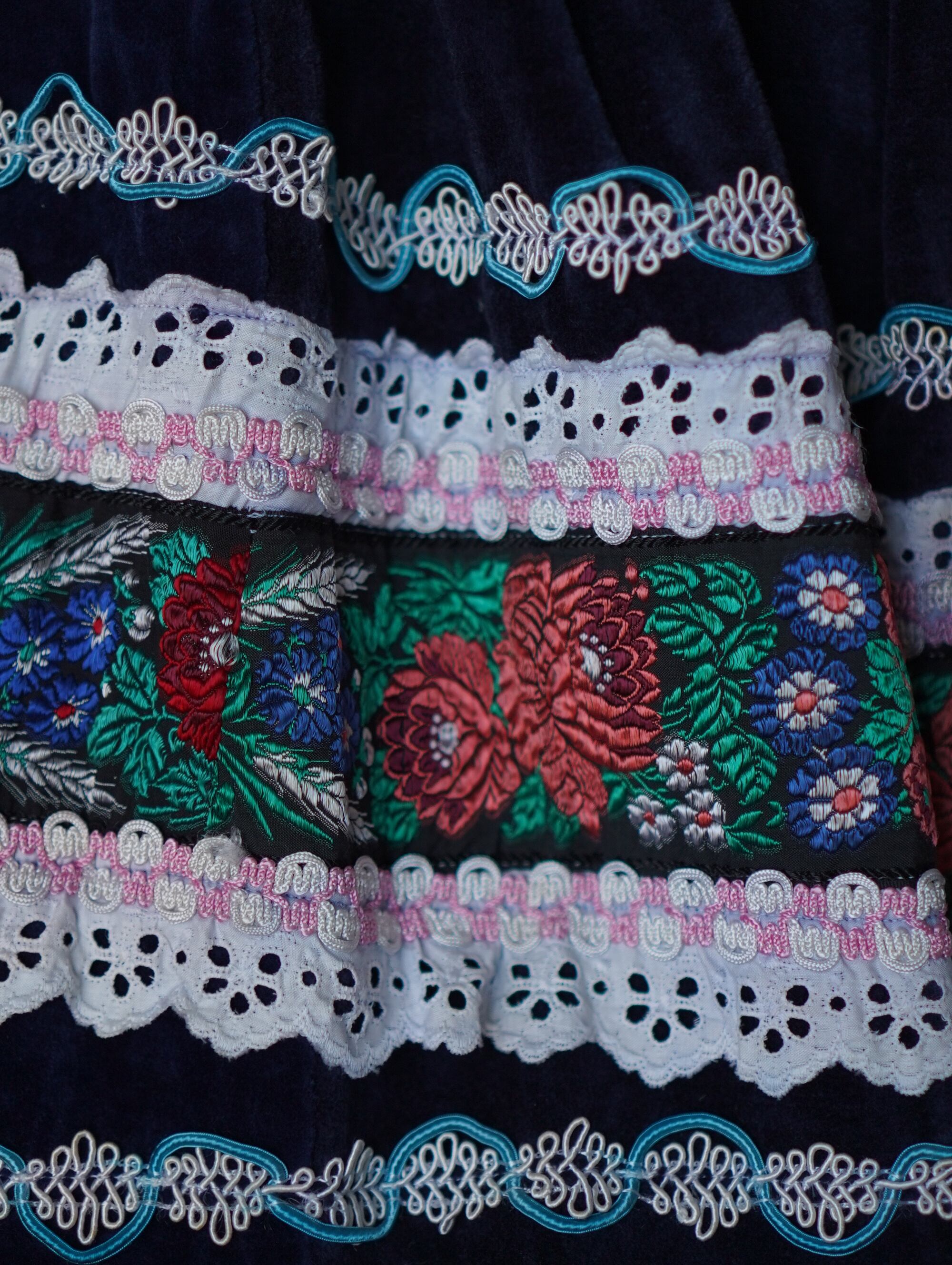 ハンガリー刺繍ならではのカラフルな色使いがかわいい。素材はおそらくベルベット。