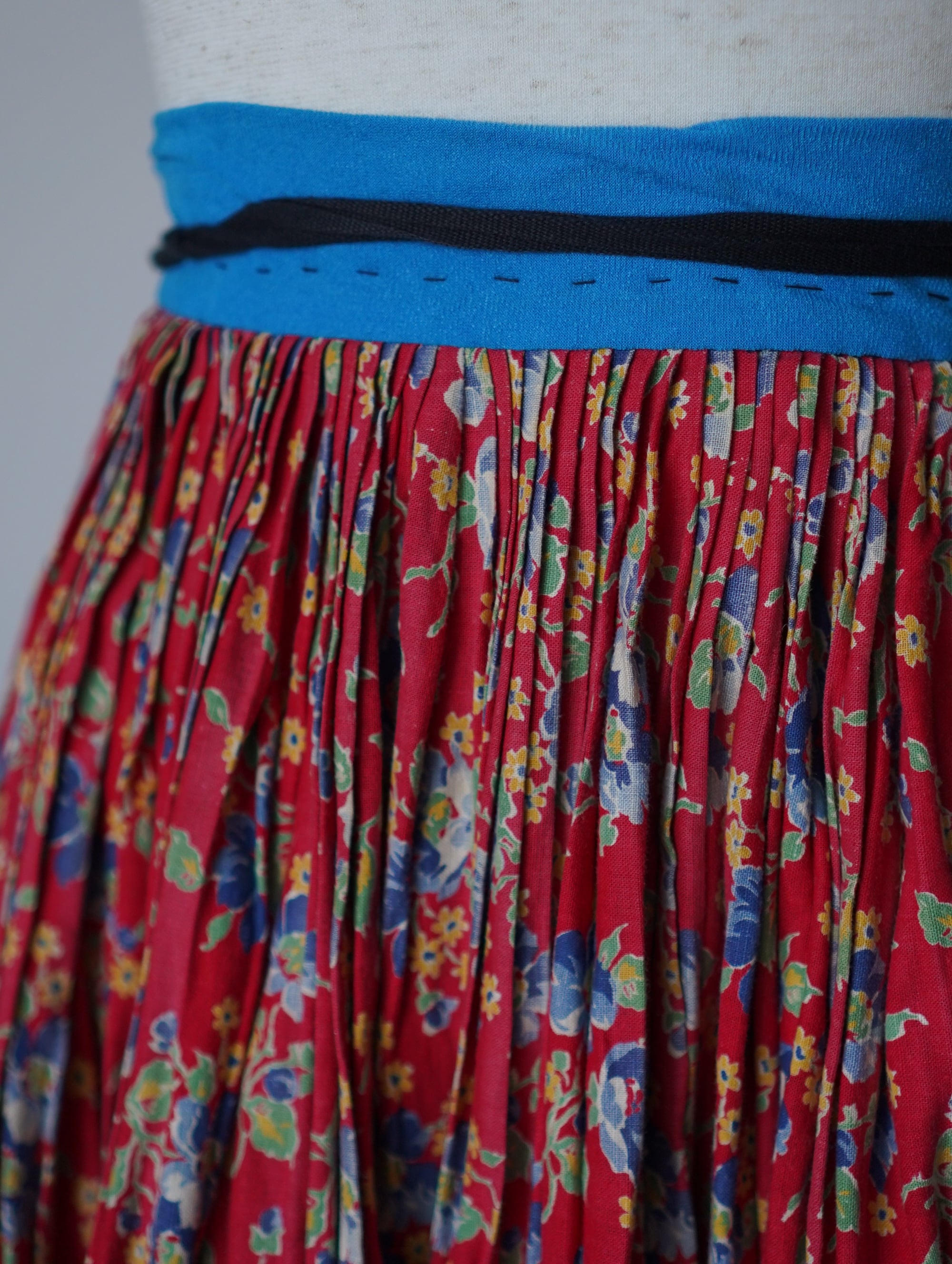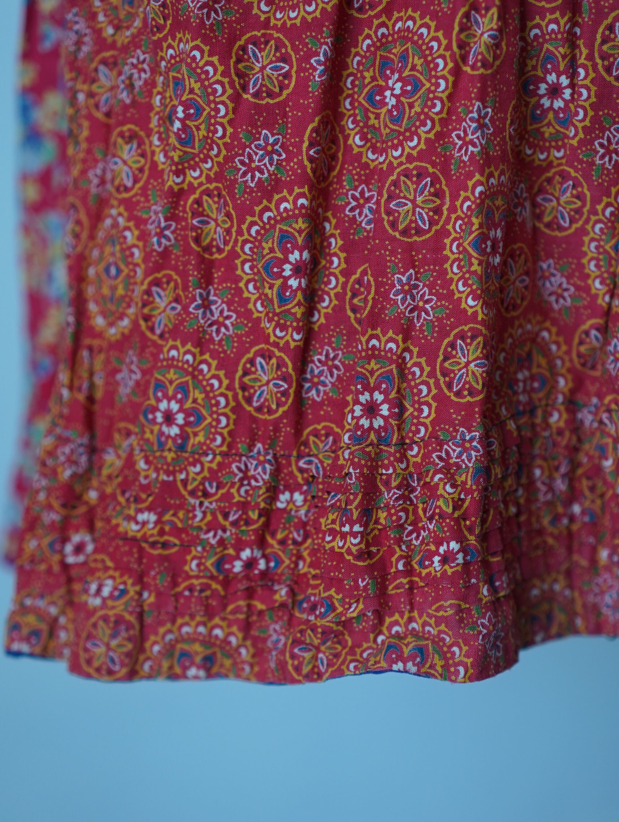 これでもかという生地を使用した贅沢なギャザーに、裾の細かなティアードデザインがまたぐっとかわいさをあげてくれます。ヴィンテージファブリックにしか出せない絶妙なレッドカラーも最高です。素材はおそらくコットン。うれしいフリーサイズ。