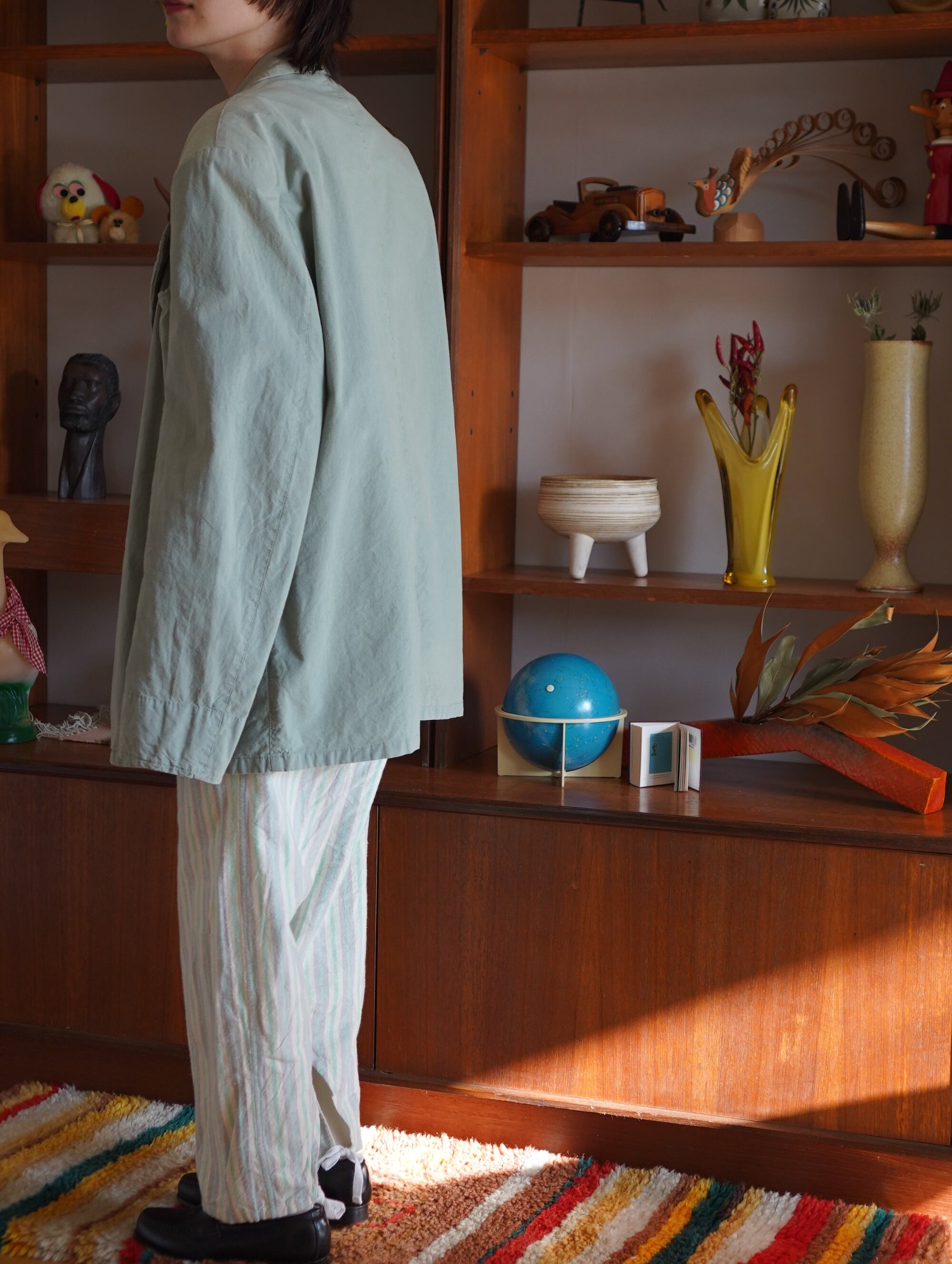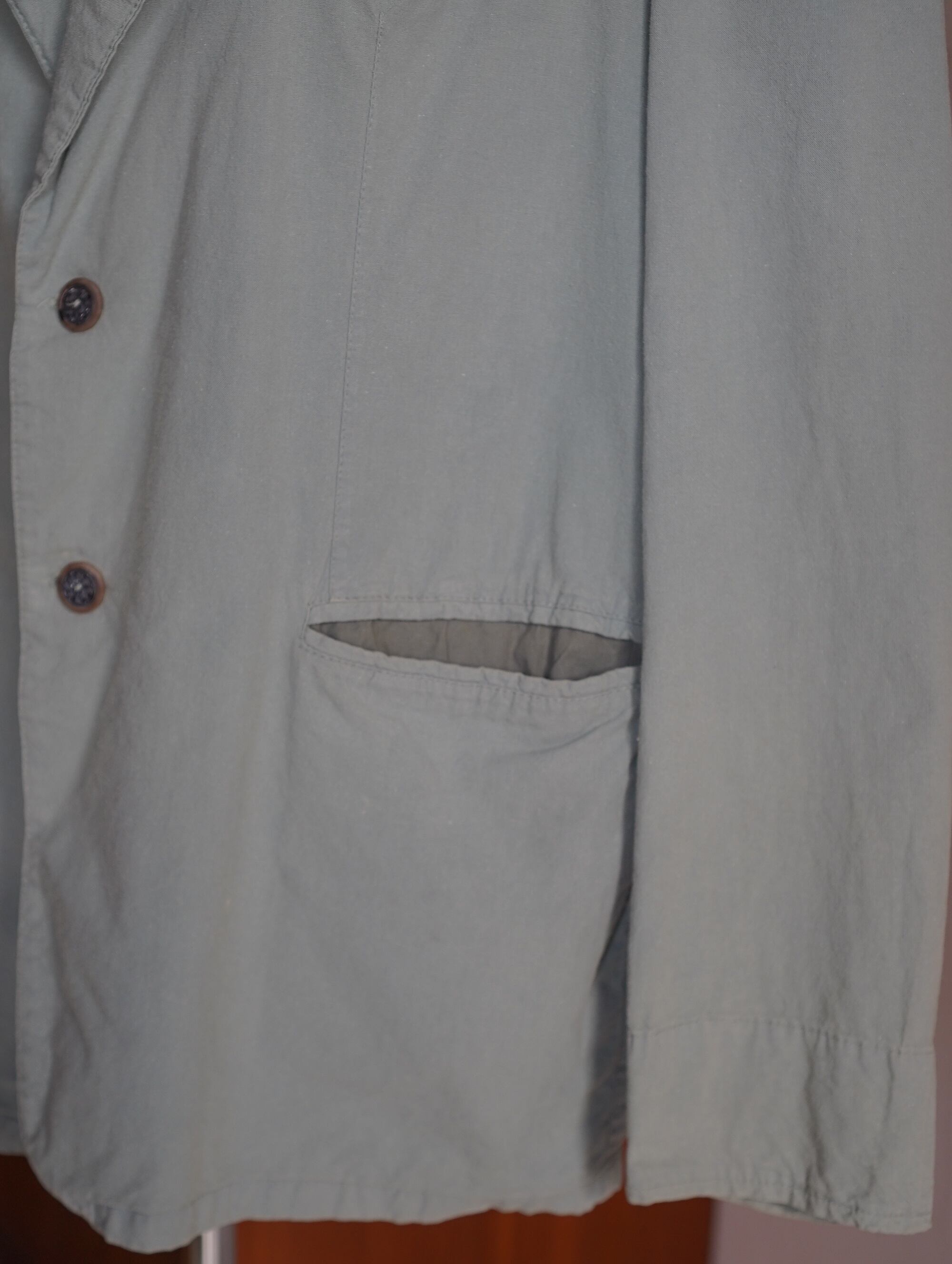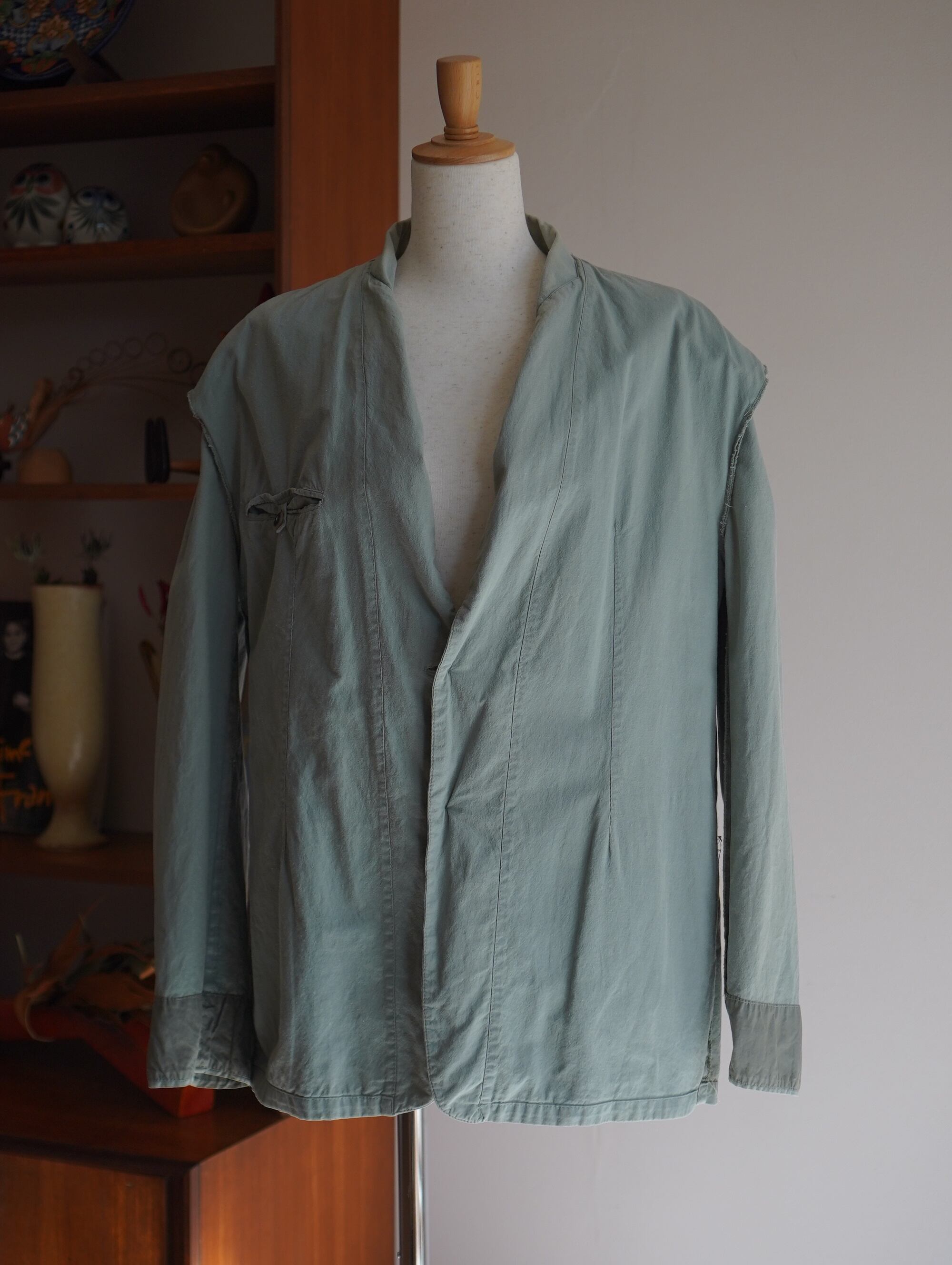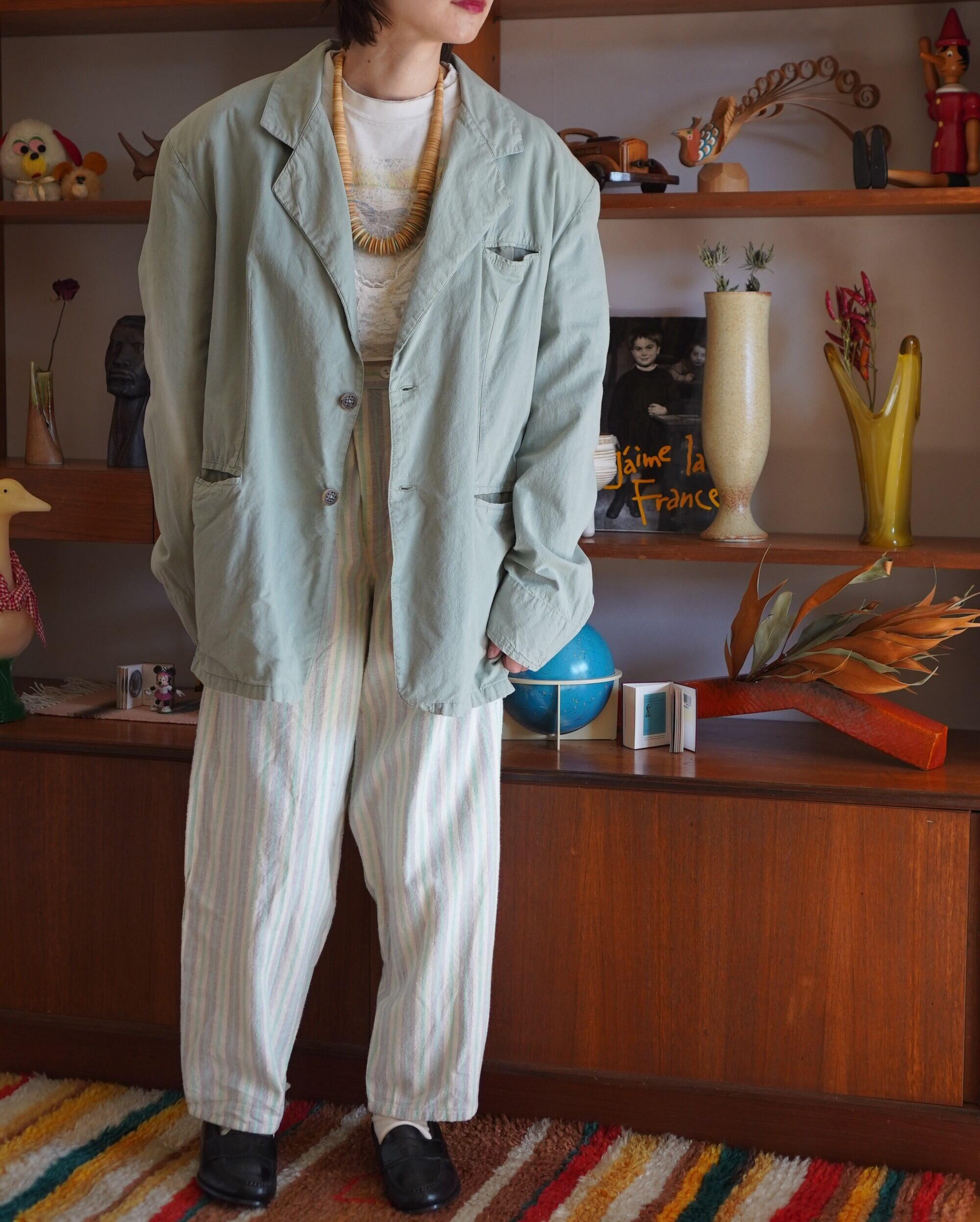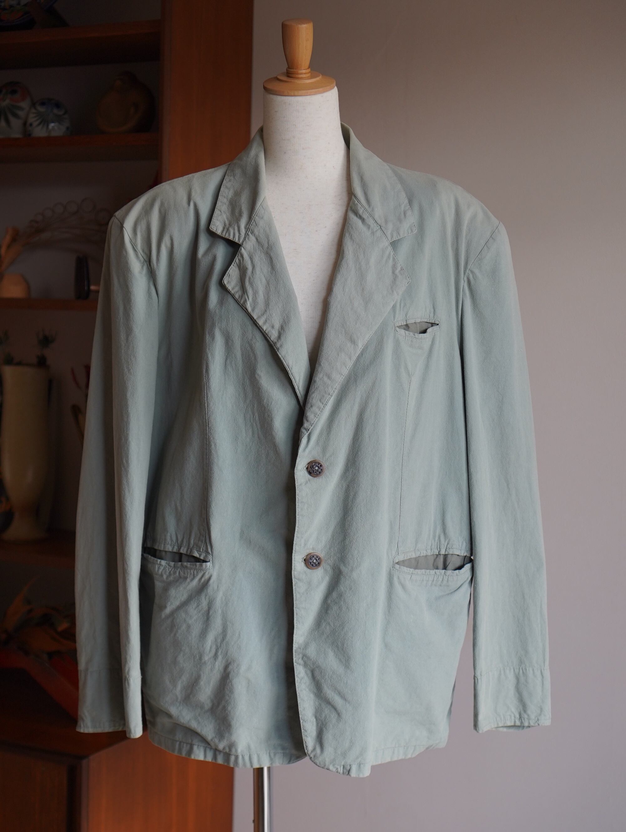 ほどよく色褪せたセージグリーンのカラーがチャームポイントのUSA製テーラードジャケット。軽い着心地で、春にもぴったり。素材はコットン。肩パッドは縫われていますが、取ることも可能です。