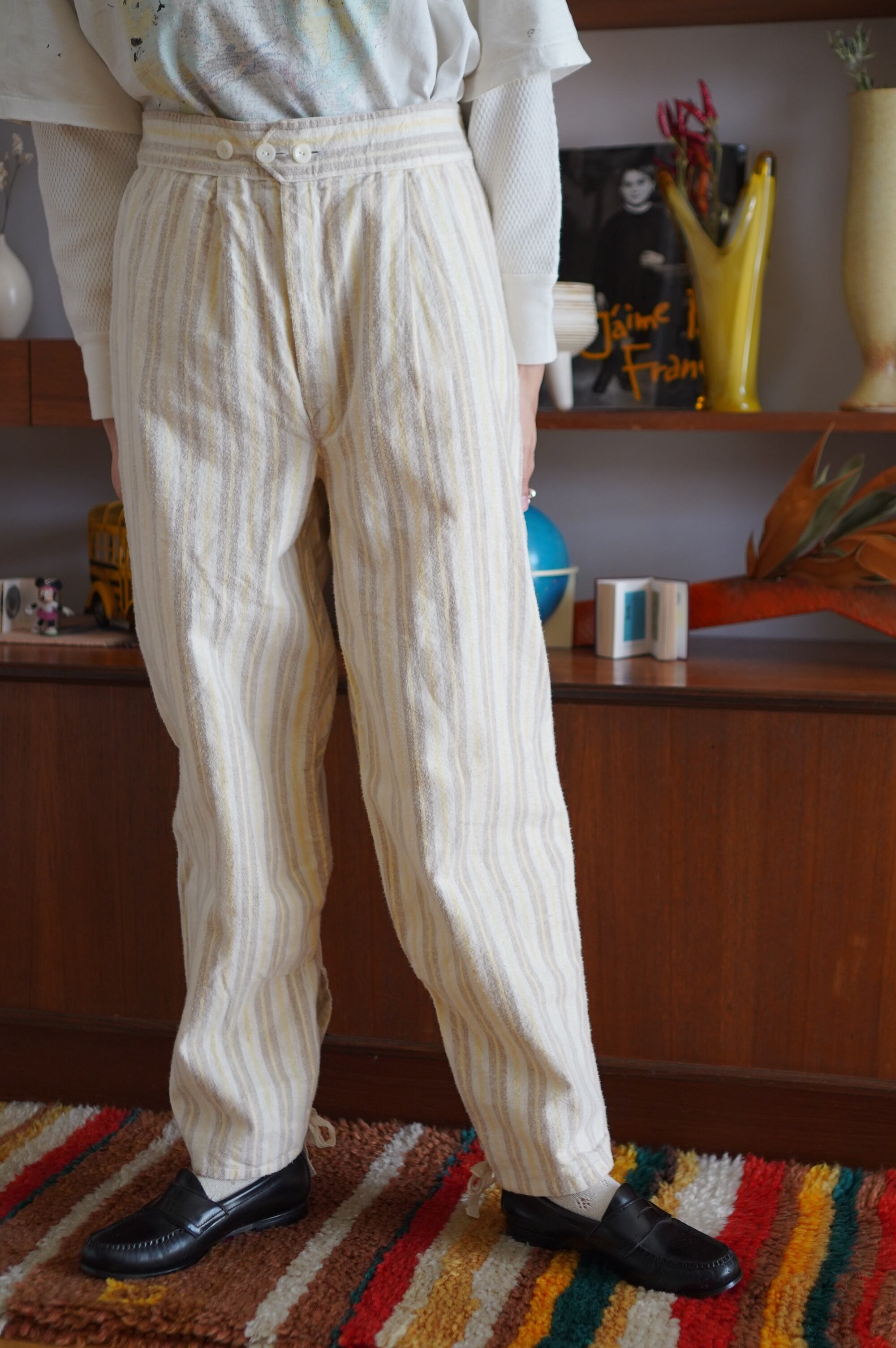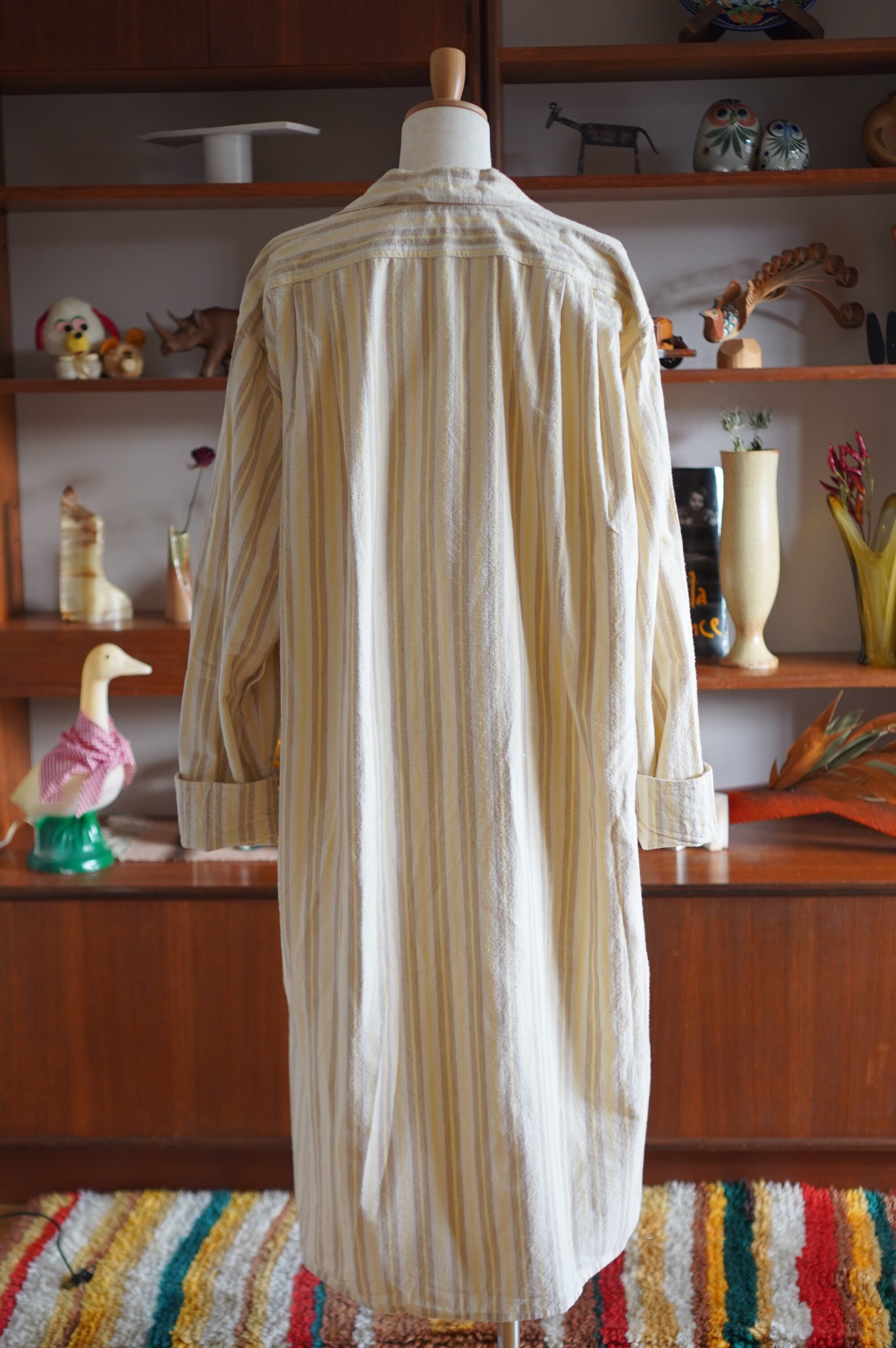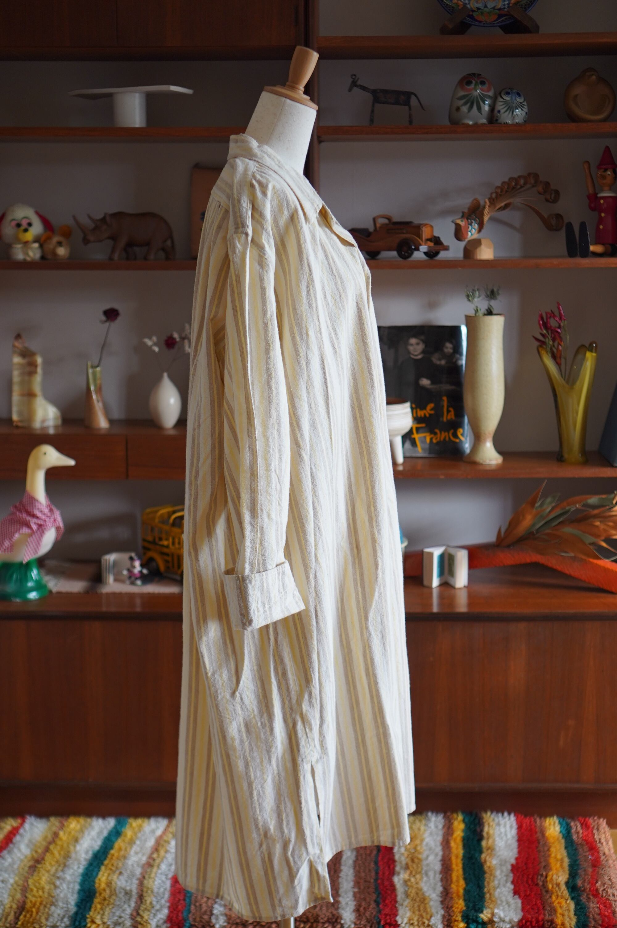 アイボリー地に、ビスケットブラウンとレモンイエローのストライプ柄。優しい雰囲気が漂います。それぞれ単体で着まわすのも楽しそうです。