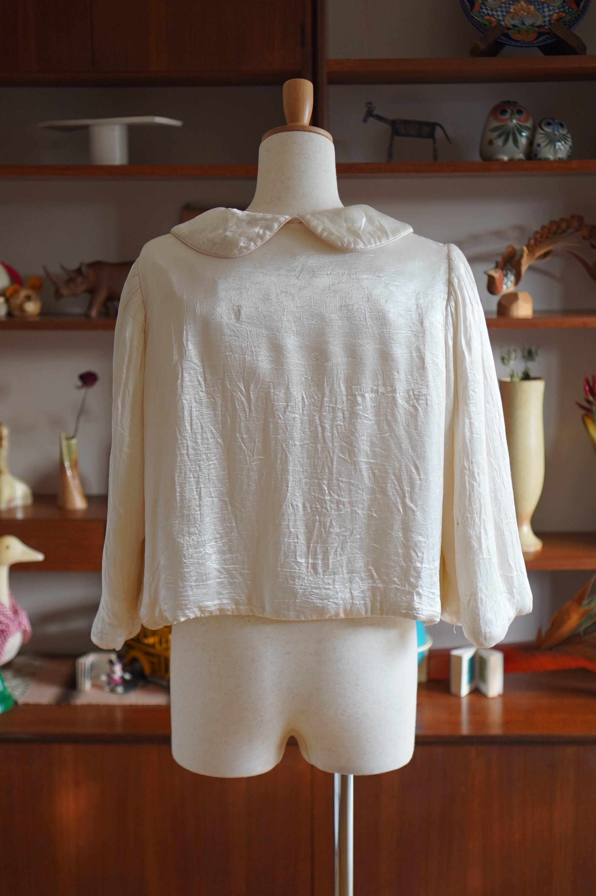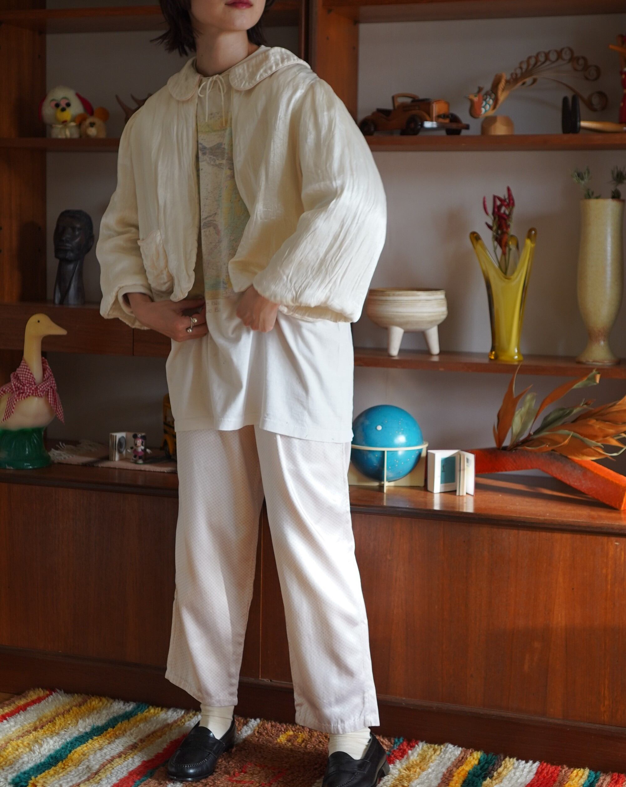 1940年代頃のキルティングベッドジャケット。高級感漂う柔らかなシルク素材で触り心地が最高です。程よい光沢感に、春を感じるホワイト。襟のさりげないピンクカラーがまたかわいい。バランスが取りやすいショートな丈感もgood!
